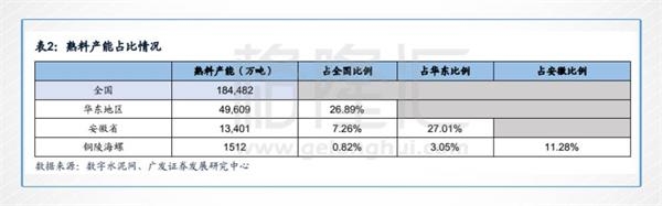 安徽是我國最大的熟料生產(chǎn)基地,2016年時熟料的產(chǎn)量位居全國的首位,在華東地區(qū)的熟料產(chǎn)能占比也高達27%。其中,安徽省的主要水泥產(chǎn)能地有銅陵,其熟料產(chǎn)能占全省比例的11%。
