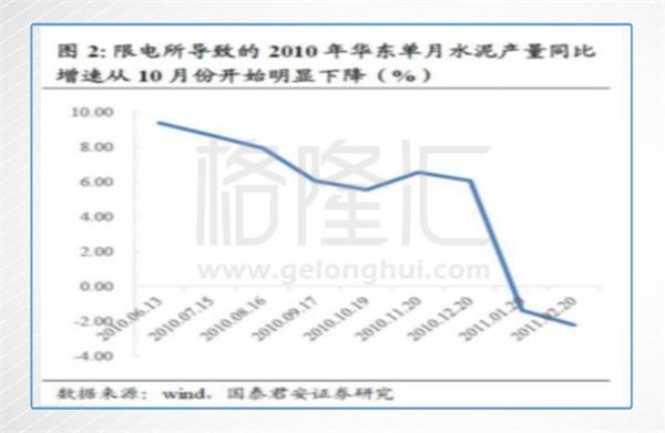 2010年7月至年底,為了完成當時“十一五”的節(jié)能減排目標,各地陸續(xù)發(fā)布措施以應對節(jié)能減排的考核,拉閘限電是最重要的行政手段。水泥作為耗電的大戶,自然也就成為拉閘首當其沖的行業(yè)之一。其中,華東地區(qū)是被限電的最主要區(qū)域。上圖是2010年華東區(qū)的熟料產(chǎn)量數(shù)據(jù),可以看到限電期間產(chǎn)量增速下滑明顯。