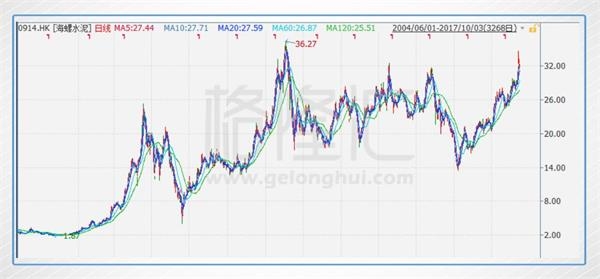 同樣是在2010下半年,海螺水泥的H股股價達到歷史峰值,36.27港元。