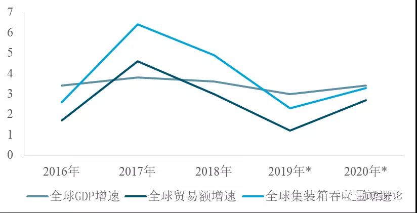 注:*表由IMF、WTO、Drewry官網(wǎng)預測數(shù)據(jù)來源:IMF、WTO、Drewry官網(wǎng)圖1 2016年-2019年全球GDP增速、全球貿(mào)易額增速、全球集裝箱吞吐量增速