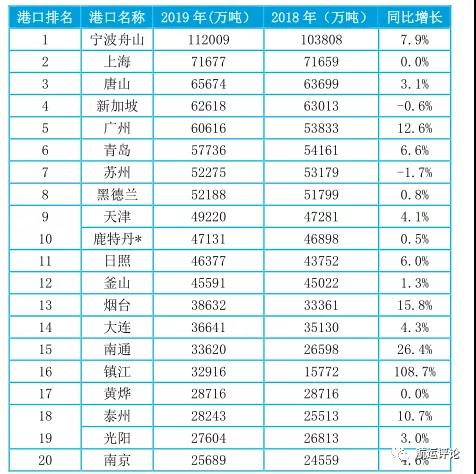 表1 2019年全球前20大貨物吞吐量港口貨物吞吐量及增速