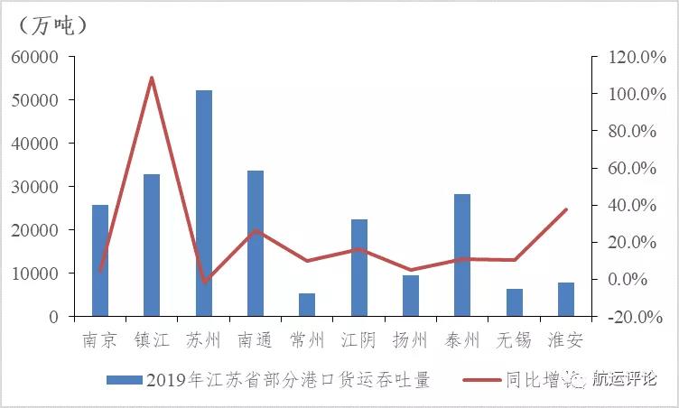 2019年中國內(nèi)河港口貨物吞吐量表現(xiàn)強勁,全國港口完成貨物吞吐量47.6億噸,同比增長19.4%,與去年增速相比大幅增長。自2019年一季度起,中國內(nèi)河港口吞吐量就保持15%以上的強勁增速,主要由于長江內(nèi)河對“黑碼頭”的整治,貨源集中至長江沿線大港,促進港口吞吐量大幅上漲。江蘇省是全國內(nèi)河港口大省,內(nèi)河港口貨物吞吐量約占全國的53%,隨著江蘇省港口資源整合的進一步推進,以南京港、蘇州港為首的江蘇省港口群不斷強化營銷網(wǎng)絡(luò)、優(yōu)化航線布局,進一步釋放一體化改革紅利,2019年江蘇省港口內(nèi)河貨物吞吐量得以大幅增長,完成貨物吞吐量25億噸,同比增長18%。其中,鎮(zhèn)江港港口貨物吞吐量增速與去年相比翻番,主要由于今年基建、房地產(chǎn)投資增速漲勢良好,鎮(zhèn)江港礦物性建筑材料實現(xiàn)大幅增長,提振港口貨物吞吐量上漲。