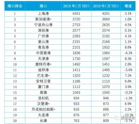 表2 2019年全球前20大集裝箱港口集裝箱吞吐量及增速