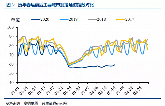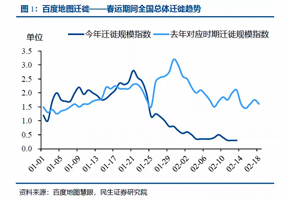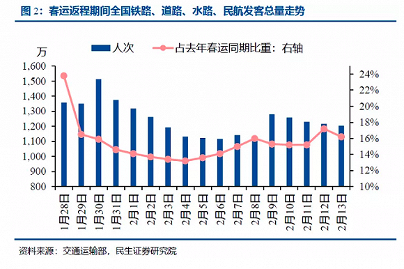 民生宏觀在日前發(fā)布的一份研報(bào)中從包括全國春運(yùn)遷移指數(shù)、全國鐵路、道路、水路、民航發(fā)客總量在內(nèi)的六個(gè)角度分析了當(dāng)前的復(fù)工進(jìn)度。