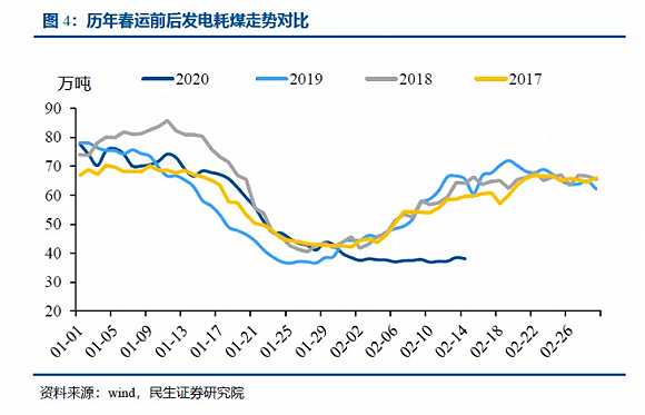 大年初九以來發(fā)電耗煤量明顯低于往年同期。根據(jù)6大發(fā)電集團(tuán)發(fā)電耗煤量走勢(shì),今年春節(jié)第二周以來,日均發(fā)電耗煤量明顯低于往年春節(jié)同期,至今沒有向上趨勢(shì)。發(fā)電耗煤量走勢(shì)反映工業(yè)生產(chǎn)情況,發(fā)電耗煤量持續(xù)低迷體現(xiàn)出工業(yè)領(lǐng)域復(fù)工率較低的事實(shí)。