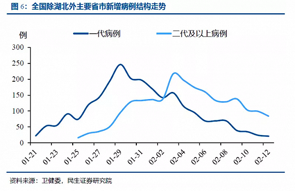 非湖北地區(qū)二代以上病例占比在提升,復(fù)工后防疫壓力較大。對(duì)全國主要省市而言,隨著自春節(jié)以來14天隔離期結(jié)束,非湖北地區(qū)新增一代病例(湖北輸入型病例)逐漸下降,但新增二代以上病例占比逐漸增多,成為新增病例主要來源。說明新冠肺炎在全國非湖北地區(qū)有二次傳播的現(xiàn)象。