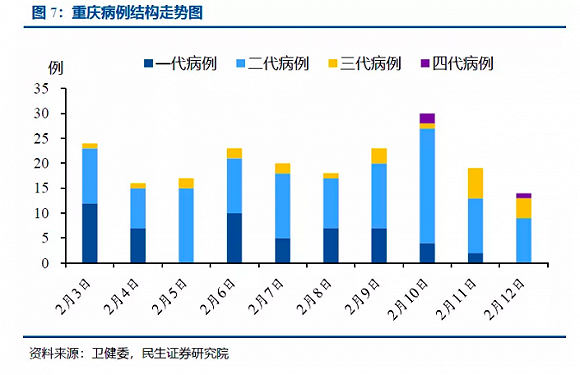 很多城市出現(xiàn)三代甚至四代病例,防疫責(zé)任仍然較大。包括重慶、溫州等多個(gè)城市均出現(xiàn)一定規(guī)模的三代甚至四代病例,這意味著這些城市疫情出現(xiàn)多輪傳播,且二代以上病例傳播路徑追蹤較為困難,地方仍然承擔(dān)著較大的防疫責(zé)任和壓力。