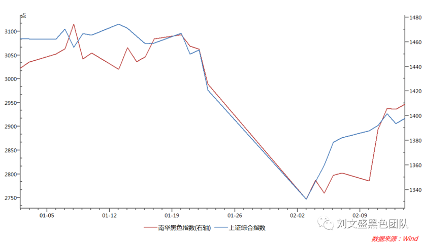但是這里面仍然會(huì)有一點(diǎn)問(wèn)題,就是黑色表現(xiàn)得過(guò)于強(qiáng)烈,因?yàn)槿绻菑?fù)工預(yù)期整體上對(duì)于工業(yè)品影響是差不多的,但是在上一周中黑色價(jià)格在所有工業(yè)品中表現(xiàn)極其亮眼,我們?nèi)?duì)比下南華工業(yè)品指數(shù)(藍(lán)色)和南華黑色指數(shù),可以明顯的看出黑色出現(xiàn)了超出整體工業(yè)品的反彈幅度。那么如果說(shuō)強(qiáng)刺激是對(duì)于整體工業(yè)品的,但是市場(chǎng)表現(xiàn)的情況確實(shí)差異很大,呈現(xiàn)出黑色一枝獨(dú)秀的狀態(tài)。那么從這個(gè)角度我們可以說(shuō)黑色品種存在了一定的過(guò)熱。