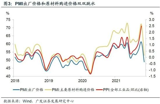代表工業(yè)價(jià)格的兩個(gè)指數(shù)單月調(diào)整幅度較大,PMI購(gòu)進(jìn)價(jià)格指數(shù)、出廠價(jià)格指數(shù)分別回落19.2個(gè)點(diǎn)、12.2個(gè)點(diǎn)。從近月價(jià)格走勢(shì)看,10月19日發(fā)改委煤電油氣運(yùn)重點(diǎn)企業(yè)保供穩(wěn)價(jià)座談會(huì)前后是一個(gè)拐點(diǎn)。以動(dòng)力煤價(jià)格為例,11月底較10月19日高點(diǎn)下行幅度達(dá)57%。