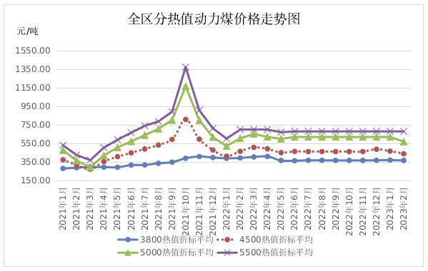 2月份,全區(qū)動(dòng)力煤月度平均坑口價(jià)格為389.69元/噸,與1月份相比(下稱環(huán)比)下降3.05%,與2022年2月份相比(下稱同比)下降5.56%。其中,東部褐煤平均坑口價(jià)格為330.71元/噸,環(huán)比價(jià)格下降1.04%,同比下降8.57%;鄂爾多斯地區(qū)動(dòng)力煤平均坑口價(jià)格為566.25元/噸,環(huán)比價(jià)格下降5.63%,同比價(jià)格下降5.63%。