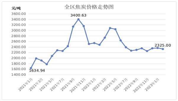 2月份,在鋼鐵下游需求淡季的影響下,焦炭?jī)r(jià)格弱勢(shì)下行。全區(qū)焦炭月度平均價(jià)格為2325.00元/噸,環(huán)比價(jià)格下降1.59%,同比價(jià)格下降6.19%。