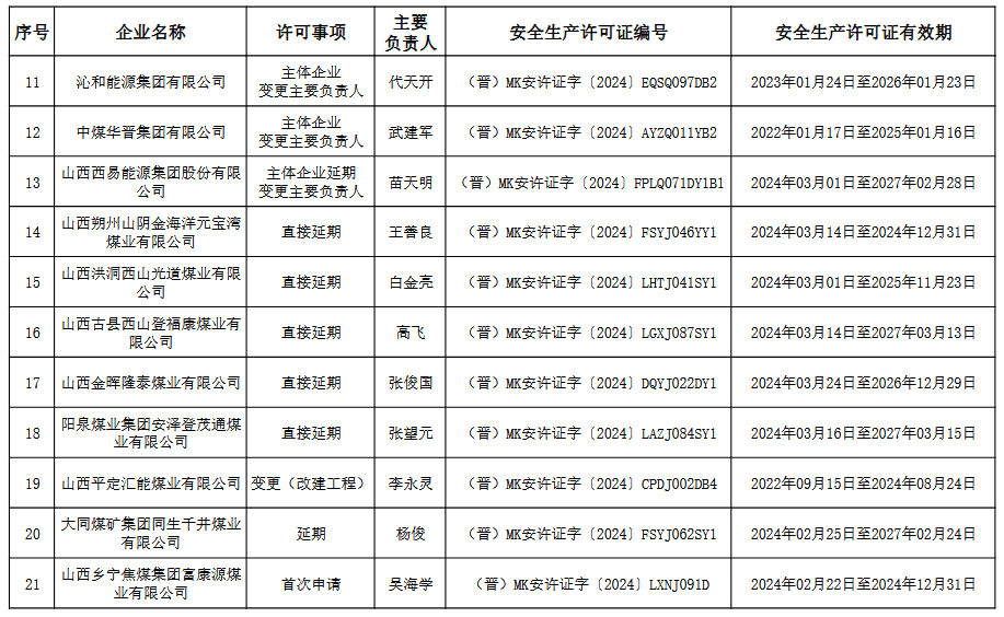 以及本次2月23日,為太原煤氣化龍泉能源發(fā)展有限公司等21座煤礦(企業(yè))頒發(fā)安全生產(chǎn)許可證。