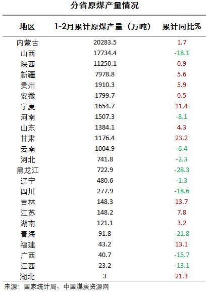 2024年1-2月份,全國23個產(chǎn)煤。ㄊ小^(qū))中,累計原煤產(chǎn)量超過5000萬噸的除上述三省區(qū)外,還包括新疆。
