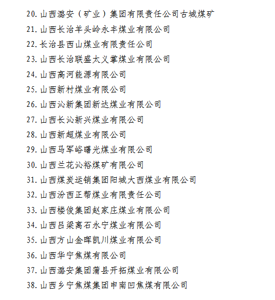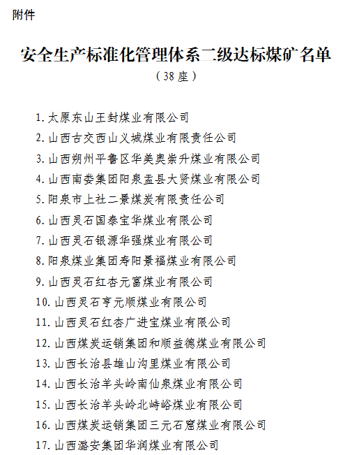 山西省應(yīng)急管理廳 山西省地方煤礦安全監(jiān)督管理局關(guān)于確認(rèn)太原東山王封煤業(yè)有限公司等38座煤礦為安全生產(chǎn)標(biāo)準(zhǔn)化管理體系二級(jí)達(dá)標(biāo)煤礦的通知