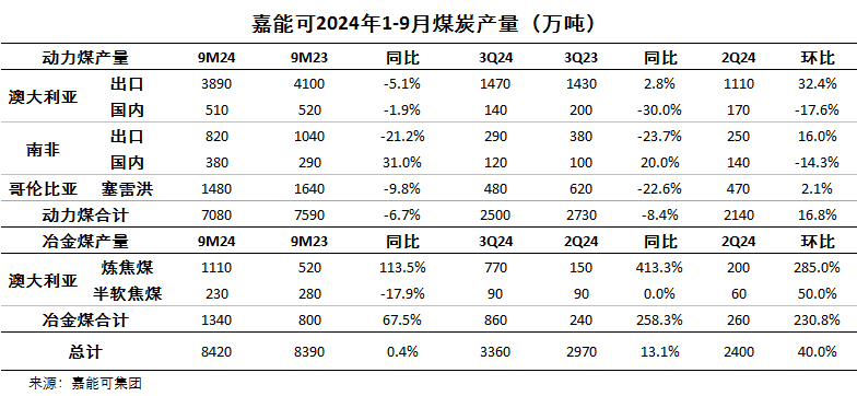 報(bào)告顯示,今年第三季度,嘉能可煤炭產(chǎn)量為3360萬(wàn)噸,同比增長(zhǎng)13.1%,環(huán)比增長(zhǎng)40%。其中,動(dòng)力煤產(chǎn)量2500萬(wàn)噸,同比下降8.4%,環(huán)比增長(zhǎng)16.8%;冶金煤產(chǎn)量860萬(wàn)噸,同環(huán)比分別大增258.3%和230.8%。