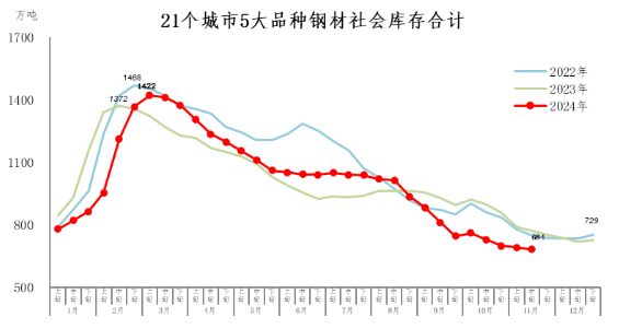 11月中旬,21個城市5大品種鋼材社會庫存684萬噸,環(huán)比減少9萬噸,下降1.3%,庫存繼續(xù)小幅下降;比年初減少45萬噸,下降6.2%;比上年同期減少89萬噸,下降11.5%。