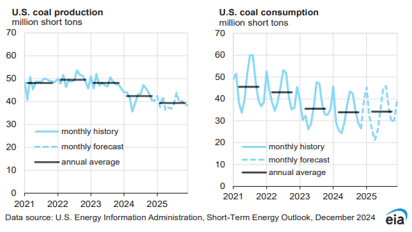 2025年,美國(guó)煤炭產(chǎn)量預(yù)計(jì)為4.723億短噸,同比下降7.17%,同樣高于前一月預(yù)期值4.691億短噸。