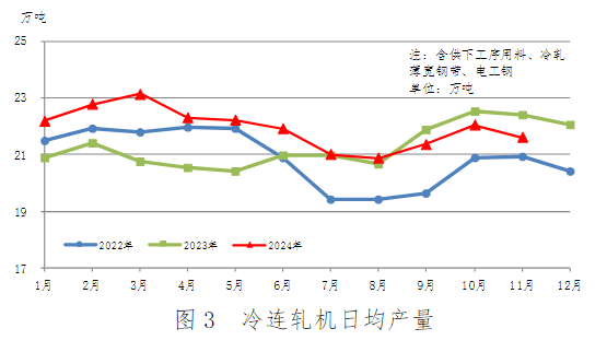 冷連軋機(jī)11月份生產(chǎn)649萬(wàn)噸,同比減少23萬(wàn)噸,下降3.4%,產(chǎn)量降幅擴(kuò)大;其中商品量427萬(wàn)噸,同比減少34萬(wàn)噸,下降7.5%;供下工序用料222萬(wàn)噸,同比增加12萬(wàn)噸,上升5.7%。冷連軋機(jī)累計(jì)生產(chǎn)7339萬(wàn)噸,同比增加307萬(wàn)噸,上升4.4%。