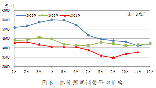 11月份,熱軋薄寬鋼帶產(chǎn)量240萬(wàn)噸,同比增加15萬(wàn)噸,上升6.8%;銷售261萬(wàn)噸,其中出口22萬(wàn)噸,產(chǎn)銷率108.8%;售價(jià)3764元/噸,比上月上漲95元/噸。累計(jì)產(chǎn)量2679萬(wàn)噸,同比增加198萬(wàn)噸,上升8.0%。熱軋薄寬鋼帶均價(jià)見圖6。