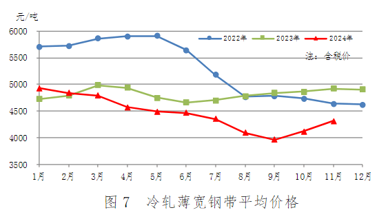 11月份,冷軋薄寬鋼帶產(chǎn)量327萬(wàn)噸,同比減少39萬(wàn)噸,下降10.6%;銷售319萬(wàn)噸,其中出口18萬(wàn)噸,產(chǎn)銷率97.6%;售價(jià)4311元/噸,比上月上漲193元/噸。累計(jì)產(chǎn)量3770萬(wàn)噸,同比增加67萬(wàn)噸,上升1.8%。冷軋薄寬鋼帶平均價(jià)格見圖7。