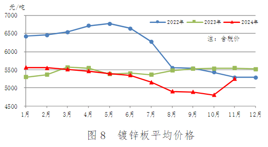 11月份,鍍鋅板產(chǎn)量232萬(wàn)噸,同比增加9萬(wàn)噸,上升4.2%;銷售234萬(wàn)噸,其中出口16萬(wàn)噸,產(chǎn)銷率100.9%;售價(jià)5250元/噸,比上月上漲445元/噸。累計(jì)產(chǎn)量2490萬(wàn)噸,同比增加173萬(wàn)噸,上升7.5%。鍍鋅板平均價(jià)格見圖8。