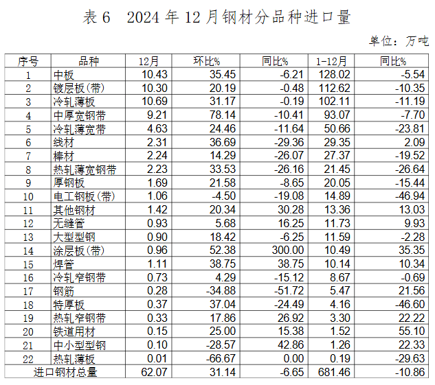 2024年,我國鋼材的主要進口來源及結(jié)構(gòu)仍保持穩(wěn)定,進口產(chǎn)品以板材為主,日韓仍是我國鋼材進口主要來源。2024年,我國鋼材進口數(shù)量持續(xù)下降,進口量較大的品種為中板、鍍層板(帶)、冷軋薄板、中厚寬鋼帶和冷軋薄寬鋼帶。進口量較大的品種全年進口量同比均有較大幅度下降。12月進口環(huán)比增幅較大,主要品種環(huán)比進口量均有較大幅度增長。
